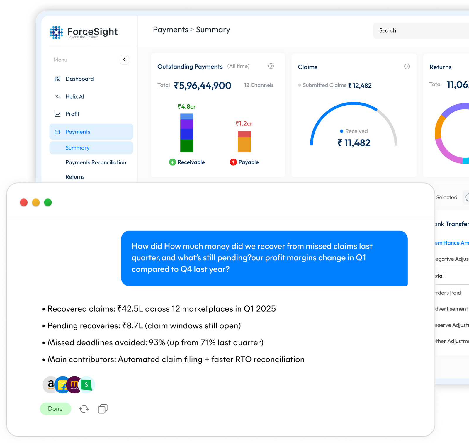 Finance teams spend days chasing payout reports. ForceSight automates reconciliation across 15+ marketplaces, detecting shortfalls, filing claims, and recovering lost working capital
