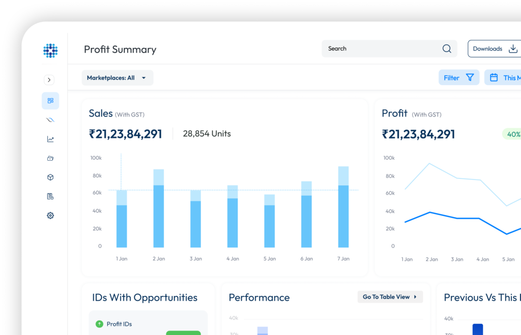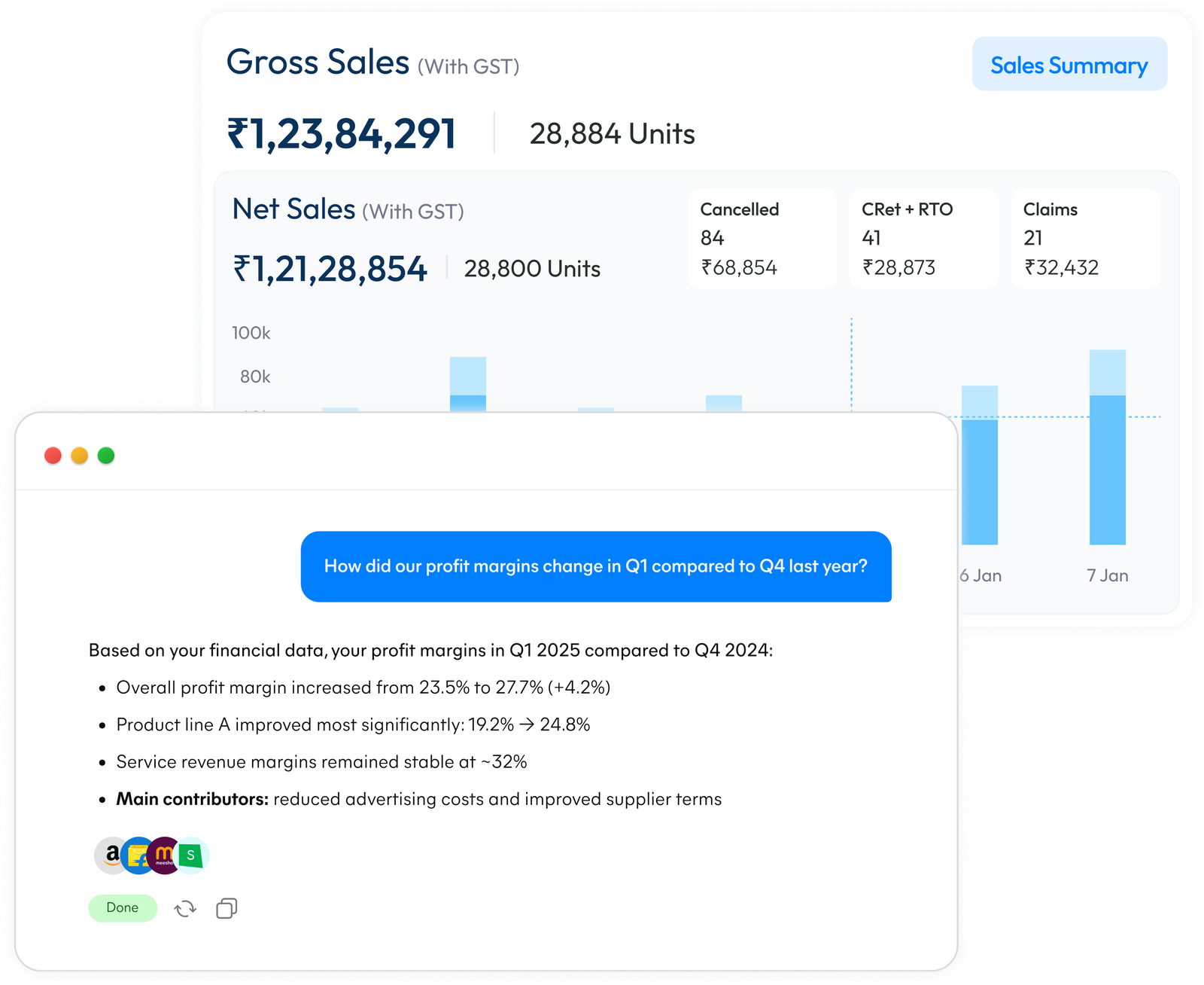 ForceSight transforms your chaotic multi-marketplace data into unified dashboards at the order, SKU and channel level. Helix AI then uses this data to show you why your margins are changing, pinpoint where you're losing cash and provide a clear path to boosting your profitability